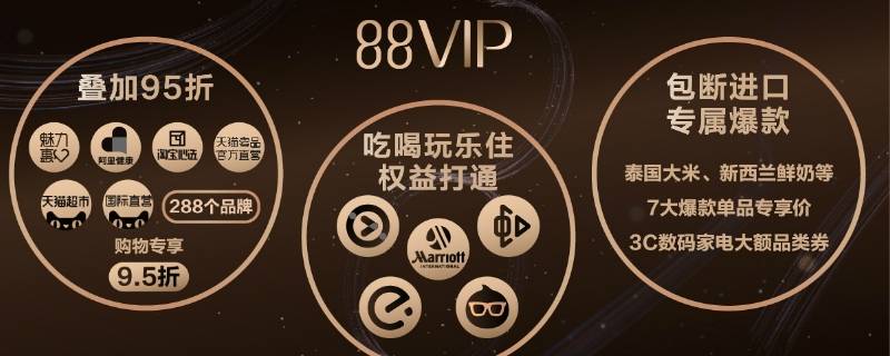 3、“88VIP”独享阿里旗下“吃喝玩乐一条龙”尊贵身份,自动升级为包括优酷、饿了么、虾米、淘票票等在内的年卡会员。
