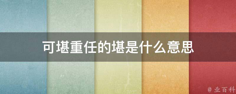 可堪重任的堪的意思是能、可以、足以。可堪重任的意思是指一个人能够承担起重大的任务,有能力肩负起重大的责任。体现了一个人卓越的能力和对自我的认知,我们每个人做人做事都要量力而行。要根据自己的实际情况去为人处事,不能好高骛远。要实事求是、脚踏实地的面对自己的人生,只有这样才能把每件事情做好。