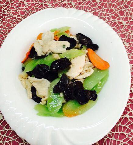 3、将莴笋和胡萝卜切片,木耳去蒂洗净备用。