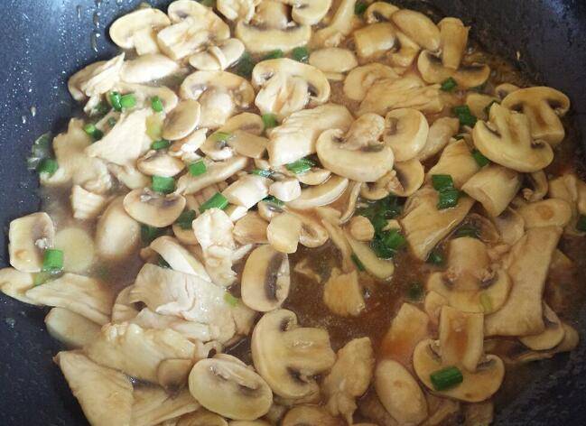 6、放入鸡胸肉,翻炒均匀。放入生抽、水淀粉、鸡精和葱段,炒匀即可。