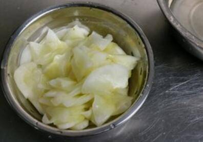1.金瓜去皮去瓤切片,加盐抓匀腌制15分钟。