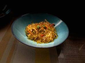 准备食材:旱藕粉丝适量、肉丝适量、胡萝卜半根、四季豆适量、辣椒适量、酱油、蚝油各一勺、盐适量。