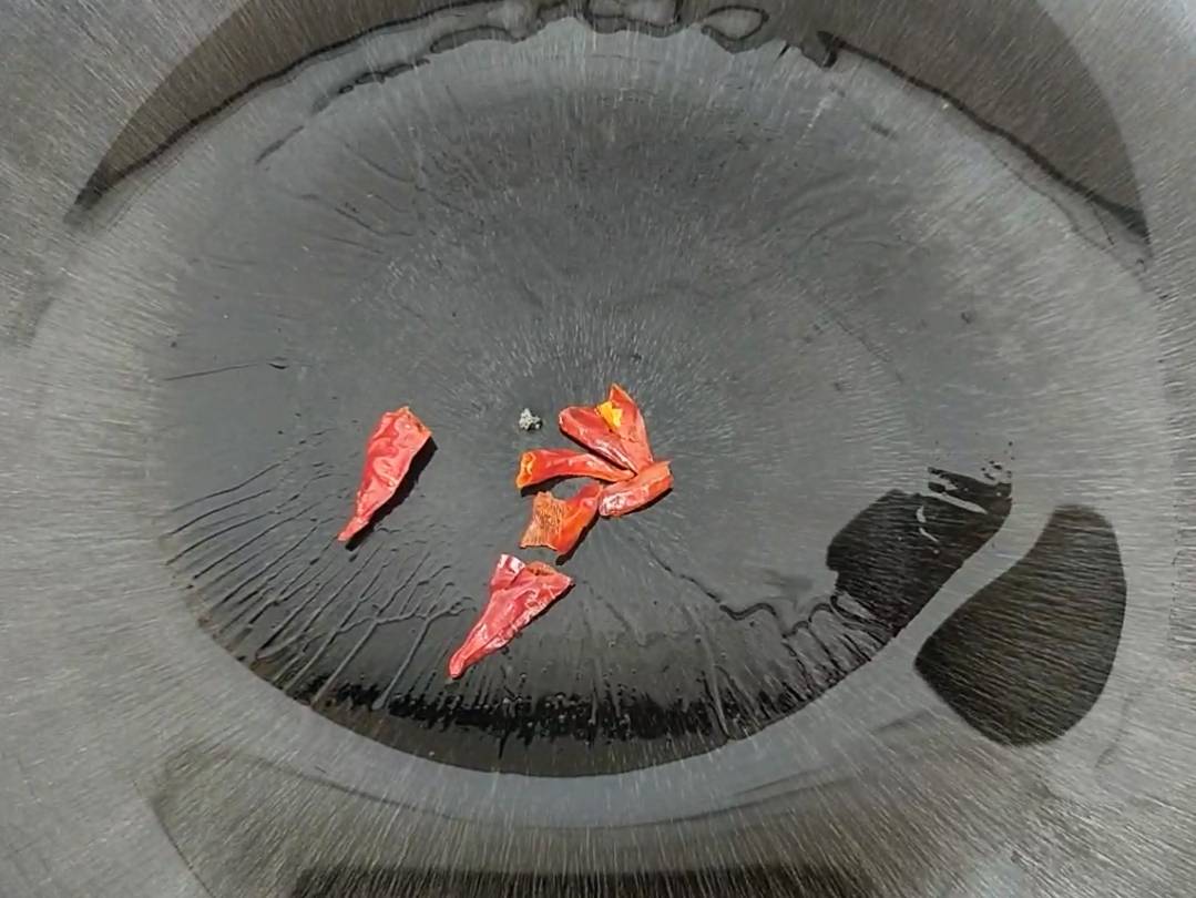2、热锅加入适量油,加入干辣椒煸炒出辣椒味。