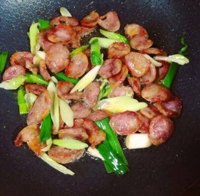 1、锅里放油,放入香肠煸炒。