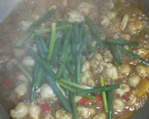 7、小米辣断生后撒香葱段,加少许味精,关火翻炒均匀。
