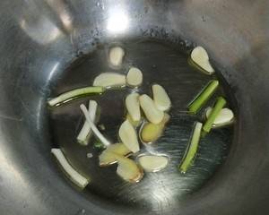 2、起油锅,放姜片,蒜瓣,葱段煸香。