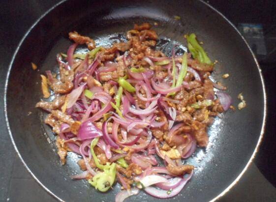 5、放入洋葱、青椒炒至熟即可。