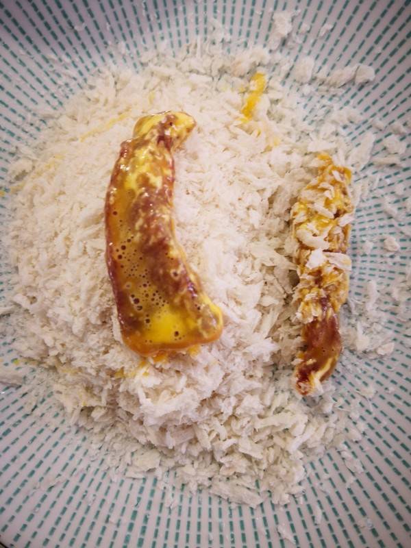 4、将腌好的牛肉片以此裹上面粉、蛋液和面包糠备用。