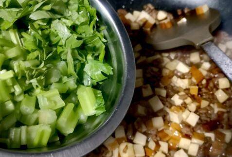 放入芹菜颗粒翻炒一分钟,放入适量盐,放入青椒圈炒至断生即可。