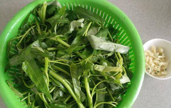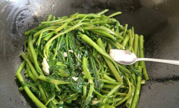 用料:空心菜300克、蒜瓣6个、油适量、盐3克、鸡精2克。