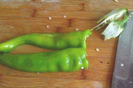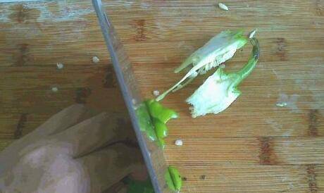 2、右手握刀,左手按照两半的尖椒,右手握刀向下切。