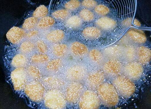 9、油热后放入搓好的芝麻球,大火炸。