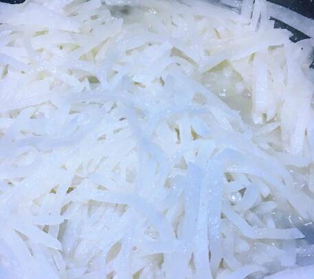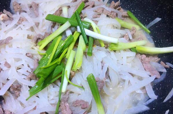 原锅下油倒入白萝卜丝翻炒至软,然后倒入炒牛肉的汁焖一下。