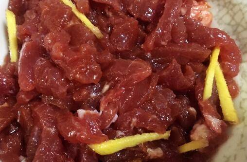 姜切丝,葱洗净切段,牛里脊肉洗干净切小条。