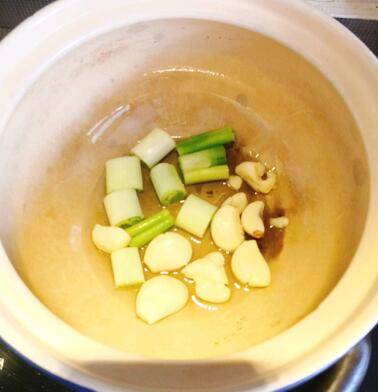 4、砂锅放油放葱姜蒜。