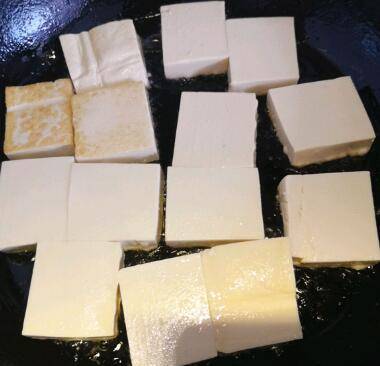 3、豆腐切块,热锅放油,放豆腐煎到两面金黄,盛盘备用。