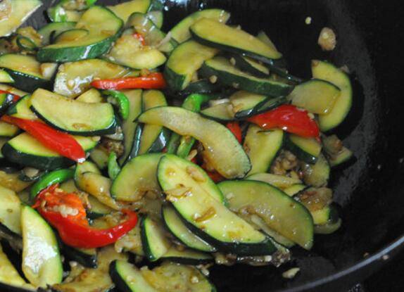 4.大蒜香气飘香,微微发黄后将节瓜片倒进去,一起翻炒至均匀裹上油。