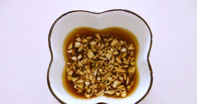 4、把蒜切成末,加少许盐、生抽、香油和清水,调成料汁,蘸汁吃即可。