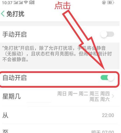 3、在“免打扰”下拉选项中,查找点击“自动开启”选项。