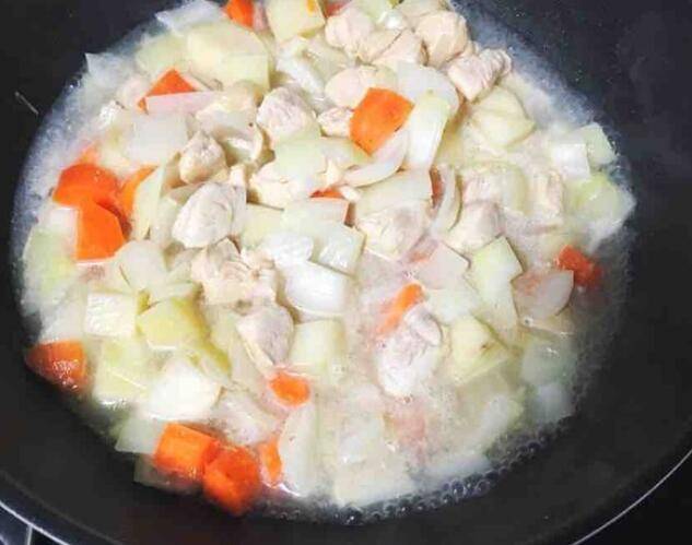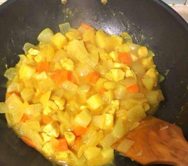 5、转小火,放入咖喱块,搅拌至完全融化,再炖煮5分钟左右至咖喱呈稠糊状鸡肉入味即可。