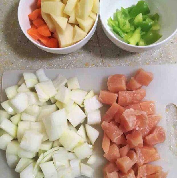 1、准备材料:鸡胸肉300克、红皮洋葱300克、土豆300克、胡萝卜100克、青椒50克、咖喱块50克、料酒15克、玉米油30克、水400毫升。