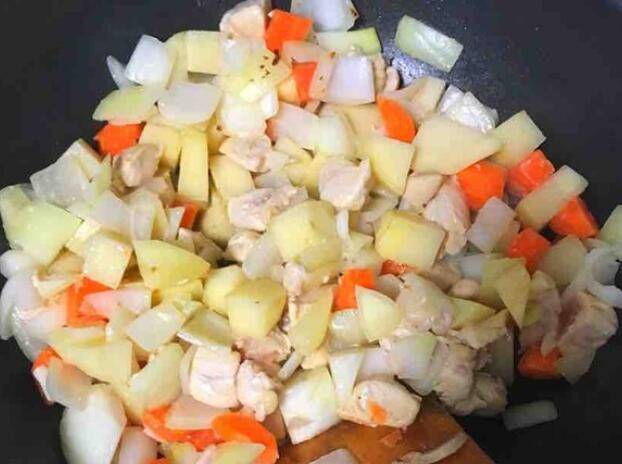 3、热锅放入玉米油,放入鸡胸块、洋葱、土豆和胡萝卜翻炒至鸡肉变色,放入料酒烹香。
