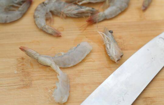 2、青虾去头,然后横刀将虾分成两半,尾部不要切段,接着去掉虾线并清洗干净。
