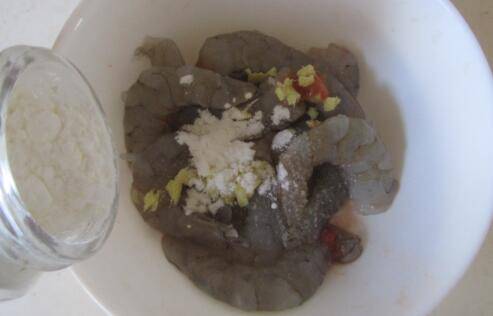鲜虾去壳后挑出虾线,再加入盐、料酒和淀粉等拌均匀,腌制一下。