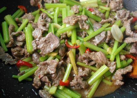 再加入泡椒和芹菜略炒,最后加入牛肉和葱段炒匀,加盐和酱油调味即可出锅。