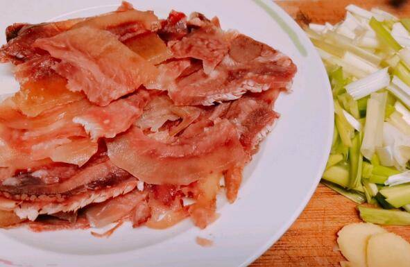 2、带皮牛肉切片,大蒜叶斜刀切寸段,姜片准备好。