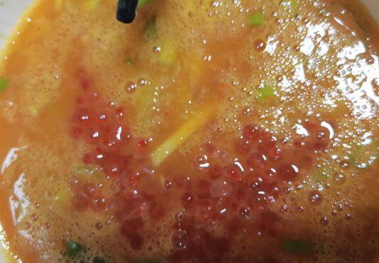 3、鱼籽倒入鸡蛋液中轻轻搅拌均匀。