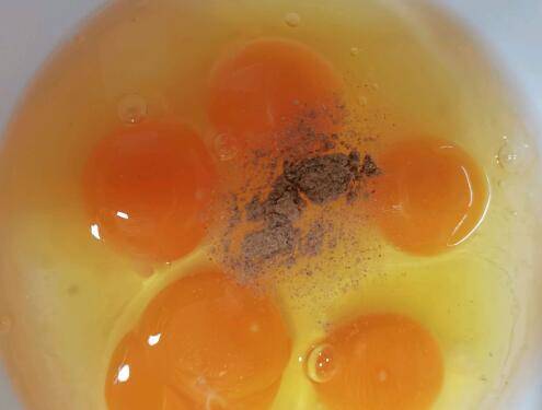 2、在鸡蛋中加十三香、葱花,将其打散。