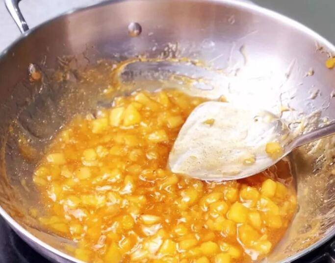 2、炒锅中倒入浸泡好的菠萝丁,再加入120克糖、20克淀粉和柠檬汁10克。