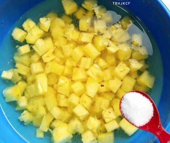 1、500克菠萝切粒后倒入水中加入5克盐浸泡10分钟左右。