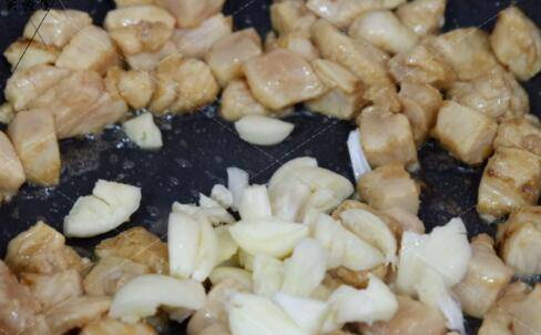 加入大蒜炒出香味,再加入香菇翻炒几下。