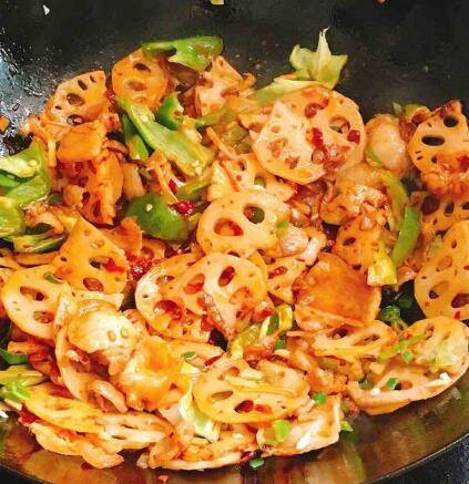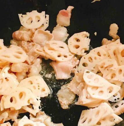 肉片变色后放入藕片翻炒。
