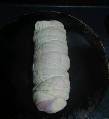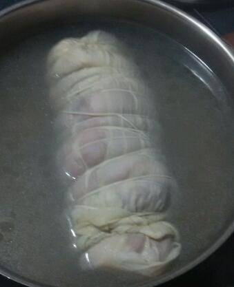 5、用白布包裹好蹄膀,外用棉绳捆绑好。