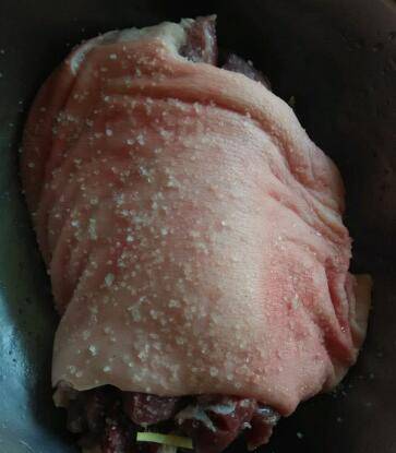 2、用盐、糖、五香粉、白酒均匀涂抹在蹄膀内外,腌制二天,在腌制期间蹄膀要每天翻身。