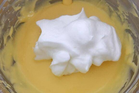 6、取三分之一蛋白霜放入奶酪糊中搅拌均匀。