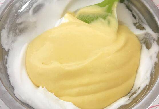 7、把拌均匀的奶酪糊倒入蛋白霜中搅拌均匀。