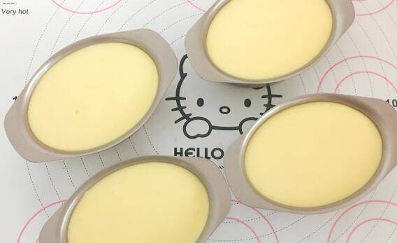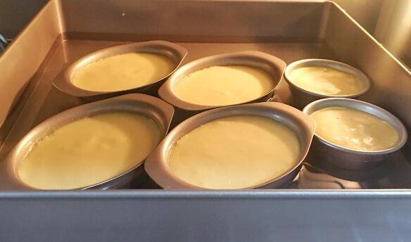 9、把模具放入烤盘中,烤盘加入三分之二的热水,放入预热好的烤箱,上火100度下火150度20分钟左右即可。