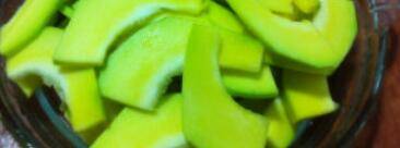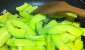 等到南瓜条变色,加入适量鸡精,翻炒几下即可出锅,南瓜是很好熟的。