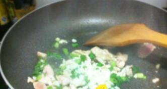 开火,油烧热后放入肉片炒香,然后放入葱和蒜爆香。