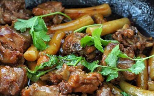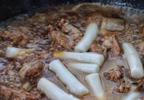 添入清水没过排骨,大火煮沸后改成中小火炖煮一小时左右,再将年糕放进去。水量最好一次加够,中途再添水会影响口感。