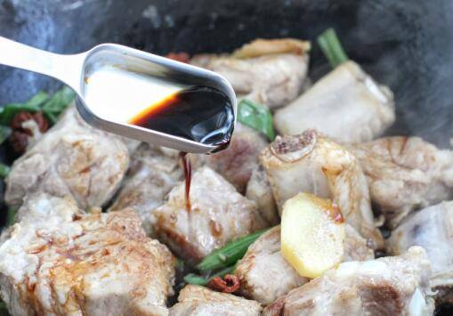 接着调入六月鲜特级原汁酱油、六月鲜红烧酱油和味达美臻品料酒,翻炒至排骨上色。
