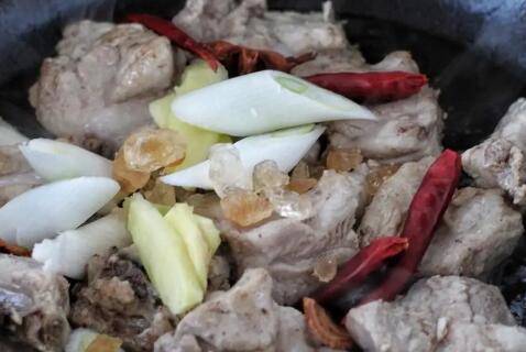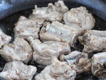 锅中倒入食用油烧热,下排骨翻炒至变色断生状态。
