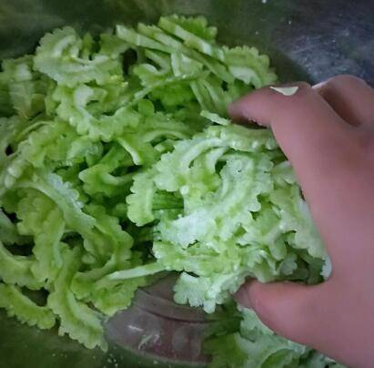 1、苦瓜切薄片,撒入盐,腌制一会儿。