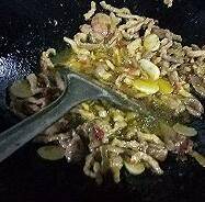 3、锅里放入菜籽油,油熟以后放入腌制好的肉丝,下锅炒香。放切片的蒜。