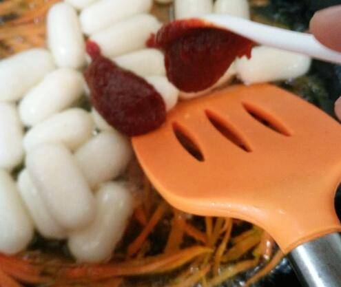 放入胡萝卜丝煸炒一下,再放入年糕、辣白菜和半碗水。
