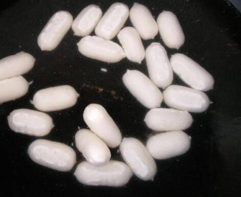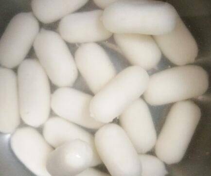 捞出放入凉水中以免年糕粘连到一起,热锅凉油避免损失掉油里的营养。